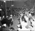 The auction tent showing the audience sitting in the bleachers looking at the steer that a girl is presenting and is being auctioned off. The grand champion steer of the show brought $5 per pound, a new high.