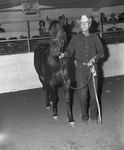 "Poco Bueno," owned by E. P. Waggoner of the Three-D Stocks Farm of Arlington, won the grand champion of stallions in the Quarterhorse judging . Bob Burton of the Three-D farm is shown with the stallion, is holding the champion ribbon.