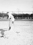 The Fort Worth Cats, a minor league affiliate of the Brooklyn Dodgers, are preparing for the upcoming 1946 season. Warming-up for a Spring Training game is Joe "Red" Bielemeier. The eighteen-year-old right-handed pitcher is a strong candidate to make the team. He went on to throw eight innings of two-hit baseball fort the Cats Tuesday afternoon. Red is shown on the rubber, entering his windup. He is dressed in his baseball uniform.