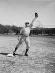 The Fort Worth Cats, a minor league affiliate of the Brooklyn Dodgers, are preparing for the upcoming 1946 season. Warming-up for a Spring Training game is eighteen-year old Preston Ward. He is one of the giant first baseman battling for a starting position. The six-foot-four-inch Ward is shown stretching for a high throw. He is dressed in a baseball uniform.