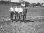 Dallas Sunset Golf Team. Left to right: Warren Higgins, Don January, Herbert Davis, and O.V. Scott. The team is shown standing outside on a field and smiling slightly. They also appear to be all making the same pose of taking a step towards the camera. Higgins, January and Davis are matching with dark trousers and a white, buttoned shirt tucked in, whereas Scott wears a dark shirt. They are also holding their golf clubs in their rights hands. Behind them a few other people can be seen, as well as a small shed.