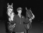 King, Queen and the General. Major General Benjamin Giles of Mineola & Arabian horses, "King Solomon" & "Queen Sheba". The two race horses are from the royal stables of the kings of Egypt and Saudi Arabia and are being presented at the rodeo by Major General Benjamin Giles of Mineola, Texas. Giles is standing between the two horses holding on to their leads, while wearing military uniform. "King Solomon" is a white horse decorated with many tassels and "Queen Sheba" is a dark horse.