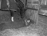David Webb, 12, sleeps in a sleeping bag in his horse' stall. The horse "Chevel Dare", next to him, won the bay gelding in the preliminaries for the $430 prize and since then David keeps constant watch until the finals. David is the son of H. B. Webb of Oakland.