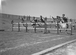 The men clear the second hurdle in this feature 120-yard event, Left to right: Don Holderman, Corpus Christi NAS; Ross Nichols, Hickam Field; August Erfurth, Rice; Ralph Tate, Okhlahoma Aggies; Oscar White of Texas A&M University, and Arthur Schwope, Ward Island Marines. Erfurth in the third lane won the event in 14.5 seconds.