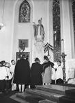 Saint Patrick's Catholic Church. Scene in Saint Patrick's Catholic Church preceding a 10 a.m. mass was the blessing by Monsignor J. G. O'Donohoe of a new statue of the patron saint of the parish, Saint Patrick, gift of the Finegan family. From left to right, facing the statue: Miss Kate Finegan, Mrs. Mary Finegan, Miss Anne Finegan. Miss Anne is shown holding ribbons while the acolytes assist the priest. The woman are shown wearing long, dark coats, while the acolytes crowd around them to help the priest. In front of them, the new statue is perched up on the wall.