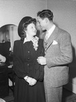 French War Bride. Lucette Michaud Green and her husband Robert Green. The happy couple are shown standing in a small room and looking into each other's eyes. Mr. Green is wearing a light colored, textured suit while his wife is wearing a long sleeved dress. The dress's sleeves are billowy and have a few, swirl designs on them.. She is also wearing a beret and a flower accessory on her shoulder. Behind them is a small vanity complete with a circle mirror and a wooden desk and chair. The couple have not seen each other in three weeks since their marriage in Paris, France.