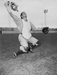 The Fort Worth Cats, a minor league affiliate of the Brooklyn Dodgers, are preparing for the upcoming 1946 season. One of the top Spring Training prospects is Danny Long, a twenty-year old catcher from Montgomery, Alabama. Long is holding up well in the day-by-day grading and will likely become one of the regular catchers this season. He is shown tossing his mask to field a foul ball. He is dressed in a baseball uniform and catcher's gear.