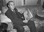 National Broadcasting Corporation (N.B.C.) President Niles Trammell. Mr. Trammell is shown sitting on a patterned couch at the Fort Worth Club and reading a local newspaper. He is wearing a suit and looking at the camera. On the other side of the couch is a small box that has a stack of papers resting on it. Behind the couch is a window covered with curtains.
