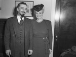 Johnson O'Connell and Mrs. Johnson O'Connell. The married couple stand beside each other, smiling widely. Mr. Johnson is wearing a suit jacket, buttoned vest and a patterned tie, while his wife is wearing a ruffled dress and a hat with netting. Behind them is a wall with a cabinet and a framed picture. To the left of Mrs. Johnson is a door and a stack of clothes.