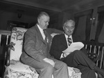 National Broadcasting Corporation (N.B.C.) officials Sheldon B. Hickox (left) and Easton C. Wooley. The two men share a seat on a floral patterned couch while Mr. Wooley reads over a document and Mr. Hickox looks on. They're both wearing patterned ties and suits, however Mr. Wooley's suit is much darker. Wooley also has his legs crossed while Mr. Hickox rests his arm on the back of the couch. The duo are two of the key NBC officials attending a conference.