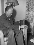 National Broadcasting Corporation (N.B.C.) Vice President in charge of programs, Clarence L. Menser. Mr. Menser is sitting in a striped arm chair, tuning a mini radio to a "soap opera". He talks about how the new mini radios are the future and will appear on the postwar markets. He is wearing a a dark suit and a patterned tie. Behind him is a tall lamp and on the wall is a floral curtain.