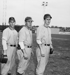 Players with the Fort Worth Cats are standing on LaGrave Field in their practice uniforms. They are, left to right, Ed Yaeger, Robert Dunn and Benny Moore. Yaeger is a southpaw and plays in the outfield.