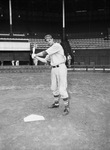 The Fort Worth Cats, a minor league affiliate of the Brooklyn Dodgers, are preparing for the upcoming 1946 season. One of the top Spring Training prospects is outfielder Ed Krage. At six-foot-four and two-hundred pounds, he is one of the bigger prospects for the Cats. Earlier in the week, Krage knocked a 400-foot home run over the center field fence. Krage is standing in the right batter's box, demonstrating his powerful swing.