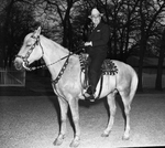 Party at Shady Oak Farm for National Broadcasting Company (NBC) officials. There is an unidentified man mounted on a horse. He is dressed in a suit and tie with a hat. The horse has a decorated saddle and bridle. There are trees in the background.
