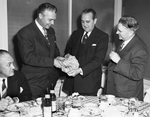 Party at Shady Oak Farm for National Broadcasting Company (NBC) officials. Three unidentified men are standing in front of a round table covered in a tablecloth. On the table are plates of food, cups, and drinks. The two men at the left are holding one dollar bills. There is an unidentified man also seated at the table at the far left.