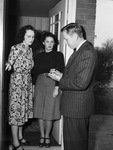 Baptist census taking. Mrs. George Esch (left|| Mrs. Ira Bentley (center|| Reverend Elmer Dunham. Reverend Dunham is shown obtaining census information from Mrs. Esch and Mrs. Bentley on their doorstep. He is wearing a dark, striped suit and appears to be writing down his data on a notepad. Mrs. Esch is wearing a long, floral patterned dress while Mrs. Bentley is wearing a black sweater and and long, gingham patterned skirt. Both women are looking on. Behind them, a small shrub can be seen next to the house.