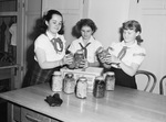 Edith M. Kempthrone Day. Left to right: Ann Richards, Thelma Sherrod, and Mary Ellen Rogers. The three girls are shown packing canned goods for a needy family as their way of observing Edith M. Kempthrone Day. They are standing around a table holding various jars of food and putting them in a marked box. The trio are all wearing their matching camp uniforms and smiling slightly. Behind them is an open door where clothes can be seen hung up on hangers. The three are students at W. C. Stripling Junior High School.