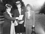 Left to right: Mrs. George V. Brooks, Miss Alice M. Hardy and Miss Mildred Williams. The trio of women are shown standing outside, looking over a couple of papers Mrs. Brookes is holding up. All of the women are dressed in dark jackets and long skirts. They are also wearing decorated, brimmed hats. Mrs. Brooks holds up a thick jacket in her other arm while her companions hold small purses. Behind them a grass road leading up to a house can be seen. There is also a fence located off to the side.