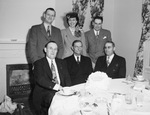 Left to right: John Renfro, Mrs. Cecil M. Williams and Ben Renfro. Seated; left to right: J. Van Renfro, J.W. Renfro and Bernard Renfro. All of the men are shown wearing dark suits with patterned ties, while Mrs. Williams is wearing a long-sleeved coat with a small hat. In front of the seated family members, is a large table covered with plates, cups and cutlery. There is also a small birthday cake set in front of J. W. Renfro. The elder Mr. Renfro and his five children have come together to celebrate his 66th birthday. John, Cecil and Ben appear to be smiling widely, while their father looks off to the side. Behind the group is a fireplace and a window curtain.