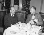 Texas Hospital Association. George Bugbee (left) and Everett J. Jones. Mr. Bigbee and Mr. Jones are shown sitting at a dinner table covered with various plates, cups and silverware. Both of them are dressed in suits, however Mr. Bugbee's suits is much darker and Mr. Jones is wearing a bow tie. The men appear to be conversing with each other, while Mr. Jones holds a smoking pipe. Behind them is a window and a small desk with papers on it. A woman sits behind another table, as well. The duo are two of the principal speakers for the three-day Texas Hospital Association convention.