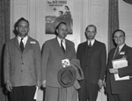 Texas Hospital Association. Left to right: Harold Prather of Sherman, Texas; Russel C. Nye of Dallas, Texas; C.J Hollingsworth of Dallas, Texas and Wayne Holmes of Wichita Falls, Texas. These four are among the many who attended the convention of the Texas Hospital Association at Hotel Texas. The group is shown standing in front of a wall that has a Red Cross poster on it, wearing buttoned, dark suits. Prather, Nye and Holmes are all shown holding either a few papers or a hat/coat as well. They appear to be smiling slightly.