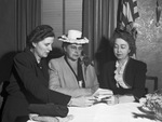 Woman's Texas Hospital Association Auxiliary. Mrs. E. C . Hodges (left) of Dallas, Texas; Mrs. T. A. Binford (center) of Corpus Christi, Texas; and Mrs. L. L . D. Tuttle of Houston, Texas. The three women are shown sitting together at a table and looking over notepad held by both Mrs. Hodges and Mrs. Tuttle. They are in the midst of planning the 1946 program for the Women's Texas Hospital Association Auxiliary. Mrs. Hodges is wearing a dark, long-sleeved coat, Mrs. Binford is wearing a frilly boat hat and a floral accessory on her jacket; and Mrs. Tittle is wearing a small, dark jacket that is embellished with some lace. Behind them a closed window and curtains can be seen.