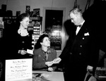 Delta Rho Delta. Left to right: Mrs. Loel Hopkins, Mrs. Marie Johnson, and Leo Potishman. Both women are members of the Delta Rho Delta sorority and are talking with Mr. Potishman, who they find to be an enthusiastic patron of their benefit book review ticket booth. Mrs. Johnson is shown seated at the booth while Mrs. Hopkins stands next to her, holding a ticket. Mr. Potishman is looking down at Mrs. Johnson as she hands him a ticket. He is wearing a dark, textured suit while the women are wearing jackets. Behind them a variety of books can be seen. The group appears to be smiling.