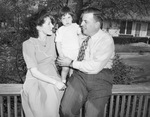 Mr. and Mrs. A.M. Gibbons and Daughter, Marshall Bruce. The small family is shown sitting on the front porch of their home, while Mr. GIbbons tells his wife about Texas. Mr. Gibbons holds his daughter in his arms as his wife looks on. Mrs. Gibbons is wearing a long dress with a small necklace and Mr. Gibbons is wearing a pair of striped trousers with a tucked in shirt. Behind them. their front yard can be seen. The married couple is smiling widely while their baby looks off to the side.
