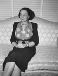 Mrs. E. A. Landreth. Mrs. Landreth is shown sitting on a patterned couch, looking off to the side. She's wearing a long, dark skirt with a patterned blouse. She rests her hands on her lap and has her legs crossed. Behind the couch there's a window with it's blinds completely closed.