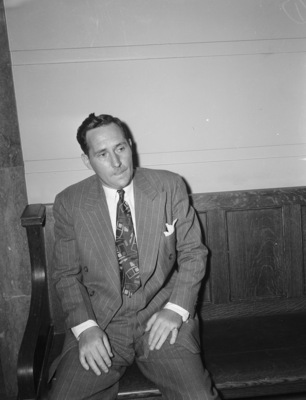 Phil Chadwick, who is facing charges in the Green Dragon narcotic case. He is being accused by the federal government of being one of the leaders of the nationwide drug smuggling syndicate. He is sitting on a bench, wearing a pinstripe suit.