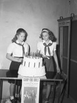 Camp Fire Girls. Suzanne Harper (left) and Jerry Denton, light candles on camp Fire Girl's birthday cake. The two girls are shown standing behind a table that has a large, frosted cake set on top of it. The cake is covered with long candles and Miss Denton is lighting each one with a bigger candle. Both girls are dressed in their camp uniform which includes long, dark skirts and a neck tie. In front of the table, there is a small Camp Fire Girls poster hung on the edge. Both girls appear to be smiling.
