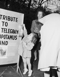 Hippo Fund. Brenda Faulknor. Brenda was one of the young Forest Park Zoo patrons who contributed to the zoo collection for the Star-Telegram Pygmy Hippo Fund. She is shown standing on her tip toes to drop coins into a donation jar that is displayed on a sign. In her other hand she is holding an ice cone. Behind her, another woman looks on. Young Brenda is wearing a small, long-sleeved dress.