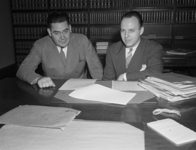 Assistant United States District Attorneys Hood, of Dallas, Texas, left, and Fonville, of Fort Worth, Texas, who are working on the Green Dragon narcotic case. Hood is wearing a double-breasted suit. Fonville is wearing a pinstripe suit. They are sitting at a desk. On the desk are several sheets of paper and documents.
