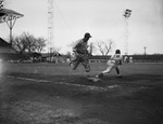 The Fort Worth Cats are hosting the visiting Milwaukee Brewers in a Minor League Baseball match-up. The Cats are a AA affiliate of the Brooklyn Dodgers while the Brewers are a AAA affiliate of the Chicago White Sox. Early in the game the Cats' fleet-footed center fielder Benny Moore raced to beat out an infield single. Mack McWhorter (18), Milwaukee first baseman, is shown stretching for the ball. The throw beat Moore by a half step. The Brewers went on to win the game 2-1.