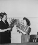 May Flower Festival. Left to right: Mrs. R. E. Hutchison and Miss Mae Jo Winn. The two women are shown holding up peach tree blossoms from Delaware that have to be stored at a low temperature to prevent full blooming. These were the first state entry for the festival. Both women appear to be smiling widely as they face each other. Mrs. Hutchinson is wearing a long, dark dress with a floral hair clip while Mrs. Winn is wearing a buttoned, striped dress. Behind her is a wooden chair.