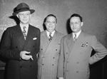 Western Petroleum Refiners Association. Left to right: Roland V. Rodman,of Denver, Colorado; E.G Youngberg of Pana, Illinois; and W. D. Cyphers of El Dorado, Arkansas. The three men are standing together in front of an empty wall, all wearing double-breasted suits. Mr. Rodman is also wearing a brimmed hat and is holding a cigarette in his right hand. The trio appear to be smiling slightly.