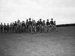 Members of the Arlington Heights High School R. O. T. C. unit, participating in the annual spring review held on the school grounds, march forward to stand inspection by Cadet Colonel Joe Holmstrom, another student. The crowd of boys and girls are shown in uniform, as a few students at the front of the pack are holding up flags.