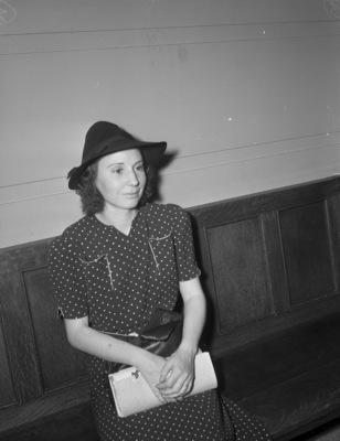 Mrs. Phil Chadwick, an alleged accomplice in the Green Dragon narcotic case. Her husband is alleged by the government to have been the Southwest representative of the nationwide drug smuggling syndicate. Mrs. Chadwick is sitting on a bench, wearing a polka-dot dress and a hat. She is holding a purse in her lap.