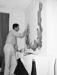 Jerry Harwell, of Fort Worth, Texas, is a veteran of the military. Since returning from war, he has turned to mural decorations as a peacetime career. The painter is shown working on an over-mantel cactus design. It takes the place of a mirror in the law offices of Morris Hodges and James M. Floyd. Mr. Harwell is dressed in a striped, button-up shirt and trousers.