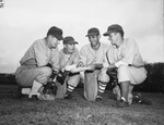 The Fort Worth Cats, a minor league affiliate of the Brooklyn Dodgers, are preparing for the upcoming 1946 season. Some of the top Spring Training prospects, left to right, are Cliff Pemberton, Jay Haney, Moe Santomauro, and Bobby Haddock. Santomauro, the Cats' right fielder, is showing his team mates the "good wood" in choosing their bats. The players are dressed in their baseball uniforms.