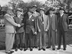 National Association of Manufacturers. Left to right: Homer Convey, Leo Teplow, Arthur Walsh, Galen McKinney, Robert R. Wason, Walter B. Weisenburger and W. W. Cumberland. The National Association of Manufacturers delegation here for a management conference are shown greeted at the city limits by the Chamber of Commerce representatives. The men are dressed in a variety of suits and brimmed hats. Some of the men are looking at the camera while others look on at Mr. Homer, who is shaking Mr. Walsh's hand.