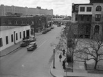 Extension of 12th Street westward from Jennings plans. The picture shows a shot of a few brick buildings and cars parked on the side of road. A few people can also be seen walking down the sidewalk. This extension would slice straight through several blocks of property. This street would be a major "feeder" for in and outbound traffic.