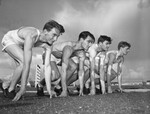 Members of the Texas Christian University (T. C. U.) track team are preparing for the upcoming three-way meet in Denton, Texas. The quartet running the mile relay, left to right, are Ed Donlin, Neil Prewit, Melvin Schumacher, and Tom Hudgins. They are shown crouching down in starting positions on the track.