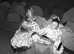 The Veterans of Foreign Wars auxiliary is sponsoring a Better Baby Show at Will Rogers Memorial Coliseum in Fort Worth, Texas. Winning the queen and king crowns, left to right, are Karen Goodwin and Stormy Starr. Karen is the 19-month-old granddaughter of Mrs. Audrey Brooks. She is wearing a crown, gown, and a royal robe. Stormy is the five-month-old son of Mr. and Mrs. J. T. Starr. He is dressed in a crown, royal robe, t-shirt, and shorts. Both children are holding their trophies.