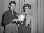 Members of the Paschal High School Reserve Officers' Training Corps (R. O. T. C.) are presenting a variety program of songs, dances, and comedy. The show is being held to recognize the R. O. T. C. rifle team winning first place in a city meet. Performing in a comedy skit, left to right, are Dick Rightmire and Sara Dewees. Mr. Rightmire, a Lieutenant Colonel in the R. O. T. C., is wearing his uniform and is holding a drum major hat. Miss Dewees is dressed in an Army uniform.