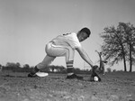 Charley Bogart is the starting first baseman on two baseball teams this season. The young southpaw will play for Amon Carter Riverside High School during the week and for the Riverside Independents on Sundays. Bogart is shown stretching for a low throw in the dirt. He is dressed in a baseball uniform.