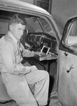 John Eddleman is a carpenter in Fort Worth, Texas. He invented a compact makeup kit that attaches to the dashboard of any car. He is shown sitting in the passenger's seat of an automobile, demonstrating how the kit can be installed within a few minutes. He is dressed in a button-up shirt and trousers.