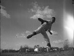 Bill "Cotton" Russell is the star pitcher on the Polytechnic High School baseball team. In 1945 Russell stared in the American baseball Legion. The talented right-hander will get the start in the Parrots opening game against the Amon Carter Riverside Eagles. Russell is shown standing on the rubber and entering his windup. He is dressed in a baseball uniform.