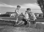 Mrs. C.A. Renton and her three children are enjoying the Texas sunshine after arriving from England earlier this week. The children, left to right, are Robbie Renton, Jimmy Renton, and Joan Renton. They are visiting the home of Mrs. Renton's parents, Mr. and Mrs. W. P. Cagle, in Haltom City, Texas. Robbie is wearing a short-sleeve shirt, shorts, and long socks. Jimmy is shown reaching for his sister's hand-made boots. Joan is the only one of the children born in Texas. She is wearing a long-sleeve blouse, skirt, and one cowboy boot. The family is sitting on a short bricked barrier and there are houses and a car in the background.