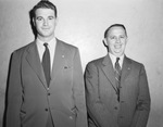 A newly organized American Legion post at Texas Christian University (T. C. U.) is electing officers. Standing against a wall, left to right, are Maurice Langford and James Mussetter. Mr. Langford, vice commander, is dressed in a suit. Mr. Mussetter, president, is a former staff sergeant in the United States Army. He is wearing a pinstripe suit.
